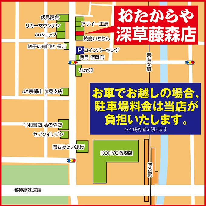 | 営業時間・料金 | お車でお越しの場合、駐車場料金は当店が負担いたします。 ※ご成約者に限ります。 駐車場の詳細は店舗へお問い合わせください。 |