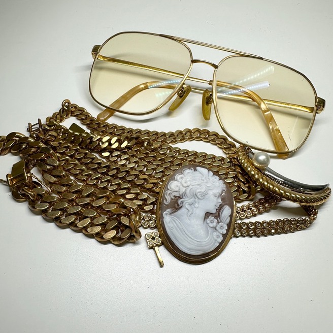 今回のように金縁のメガネも、フレーム部分に金が使用されている場合はお値段がつくことがございます👓